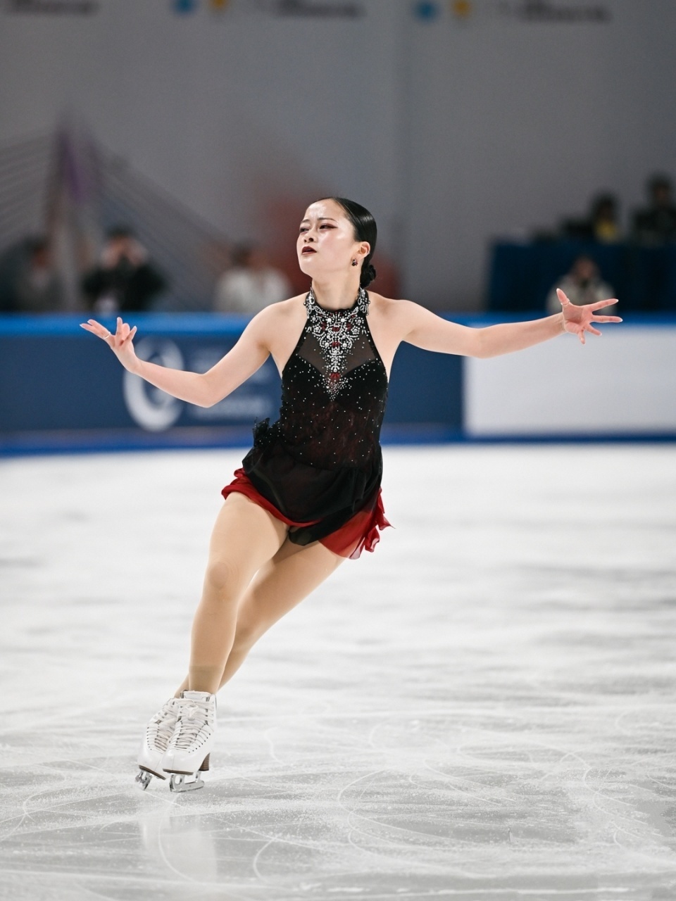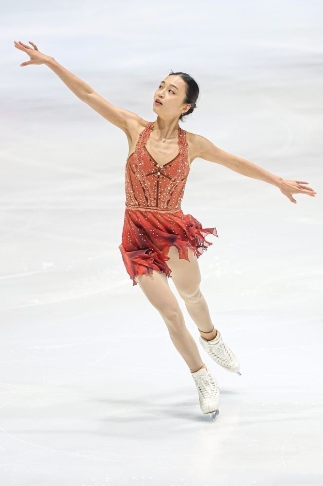 韩国选手辛智娥后内点冰三周也有失误,整体要比上周法国站好很多,拿到68.01分。